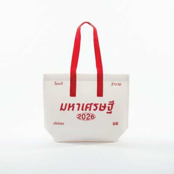 กระเป๋าผ้า Non Woven สกรีน มหาเศรษฐี สายสีแดง กระเป๋าสีขาว ขนาด 43x56CM